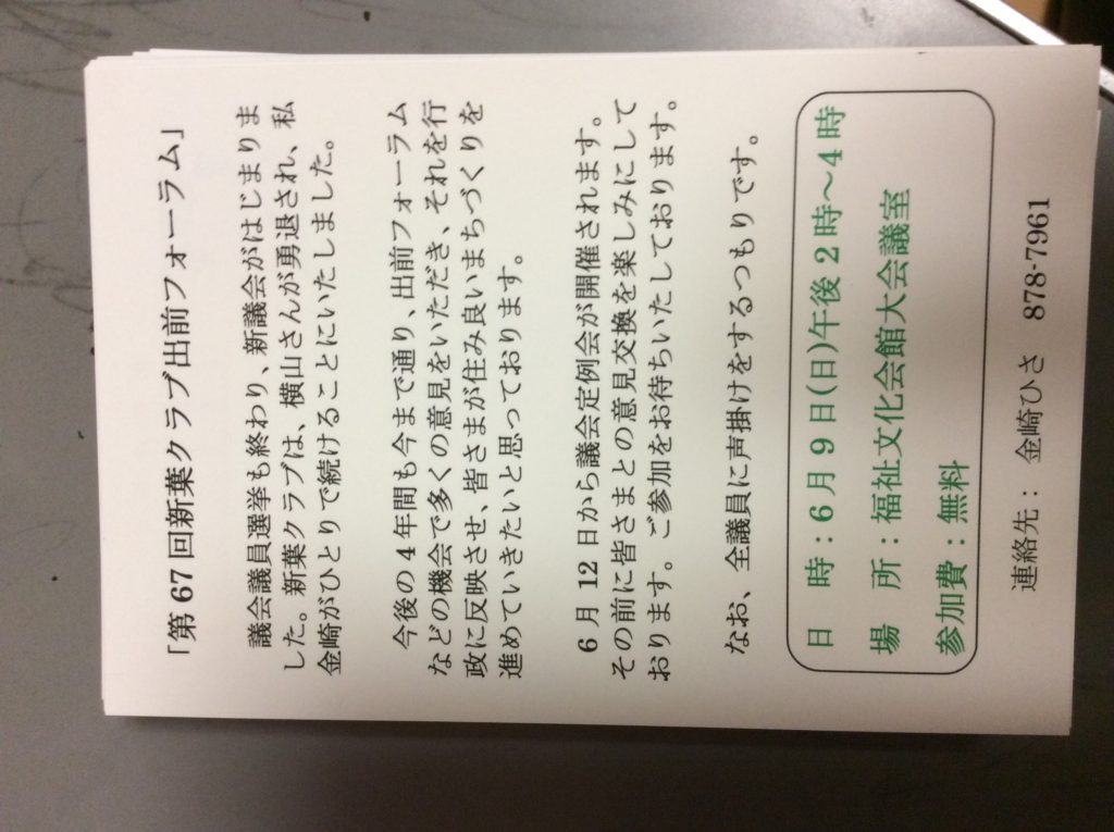 今回の選挙後、会派は私一人になりましたが、出前フォーラムは継続してまいります。